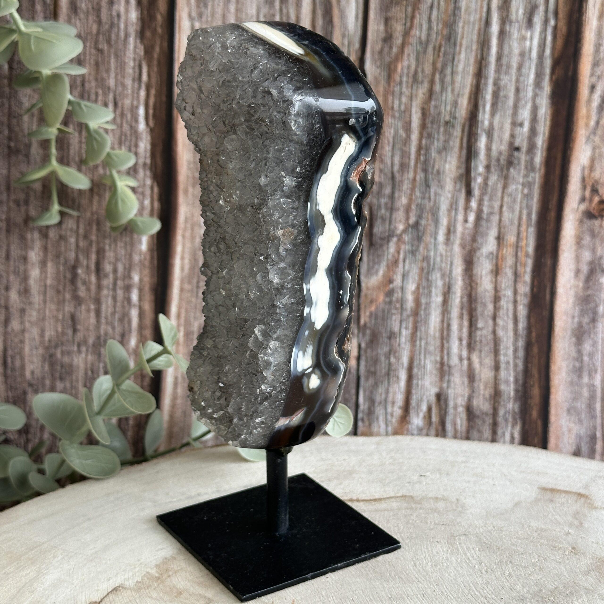 Deze agaat met bergkristal kern op standaard laat een prachtige combinatie zien van gelaagde agaat en een heldere kristallen kern. De buitenzijde heeft natuurlijke lijnen, terwijl de binnenkant een subtiele en frisse glinstering geeft.