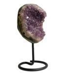 Het stuk is gemonteerd op een stevige metalen standaard, waardoor de geode perfect rechtop staat en zijn unieke vorm optimaal tot zijn recht komt. Deze combinatie van natuurlijke pracht en moderne presentatie maakt het een indrukwekkend decoratiestuk voor in huis, kantoor of praktijkruimte.