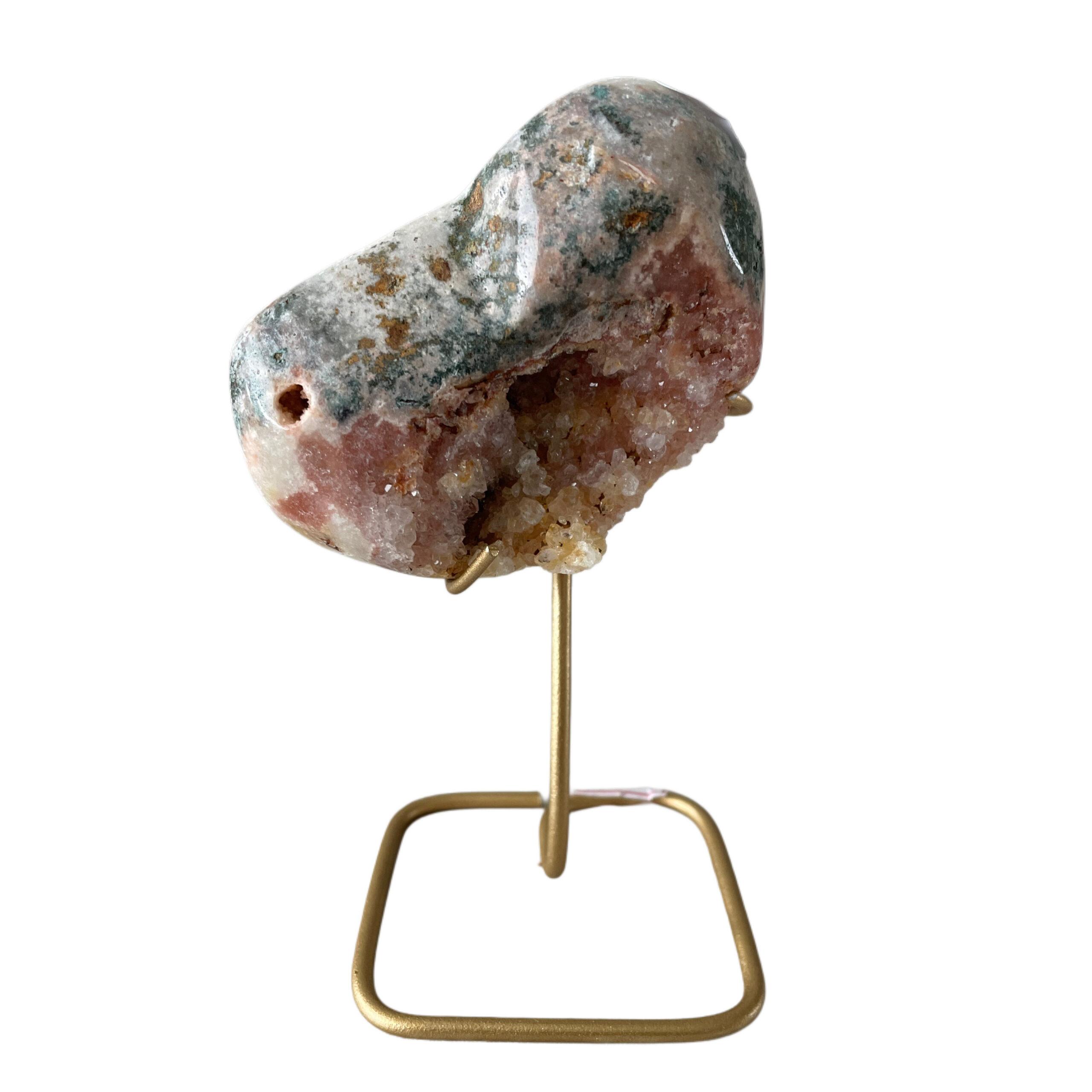 De standaard zorgt ervoor dat dit bijzondere hartvormige sculptuur optimaal tot zijn recht komt. Elk exemplaar is volledig uniek in kleur, vorm en kristalstructuur, variërend van zachtroze tot dieper paars met lichte druzy-insluitingen. Hierdoor ontvang je altijd een authentiek en eenmalig stuk dat speciaal bij jou past.