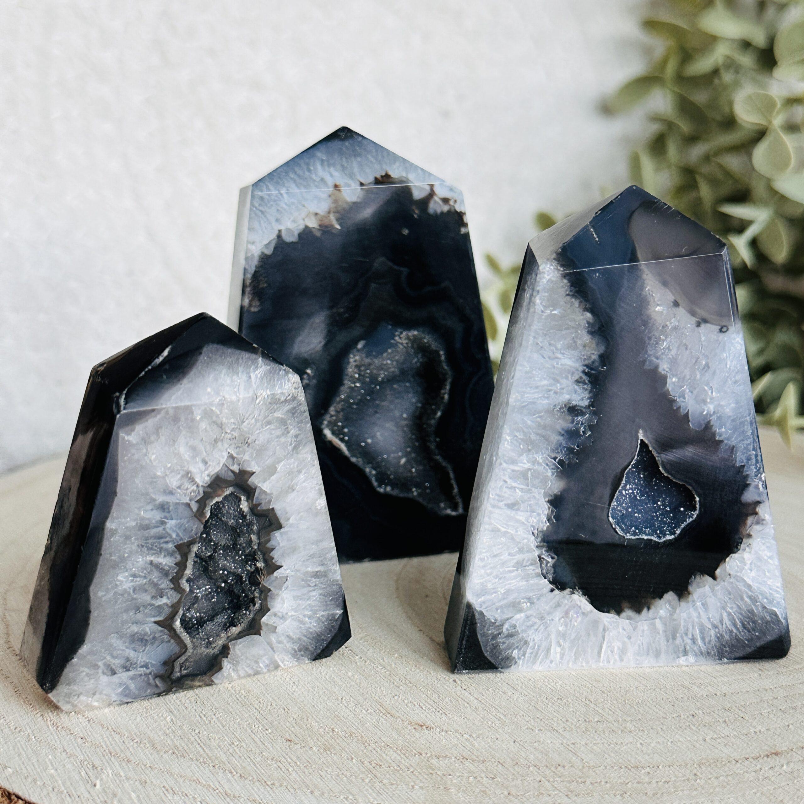 De obelisk toont prachtige natuurlijke structuren met een contrasterende kristalkern, vaak omringd door lichtere agaatlagen. Dit zorgt voor een indrukwekkend spel tussen donker en licht en geeft elke obelisk een uniek karakter. De gepolijste afwerking benadrukt de diepte van de steen, terwijl de natuurlijke patronen zichtbaar blijven.